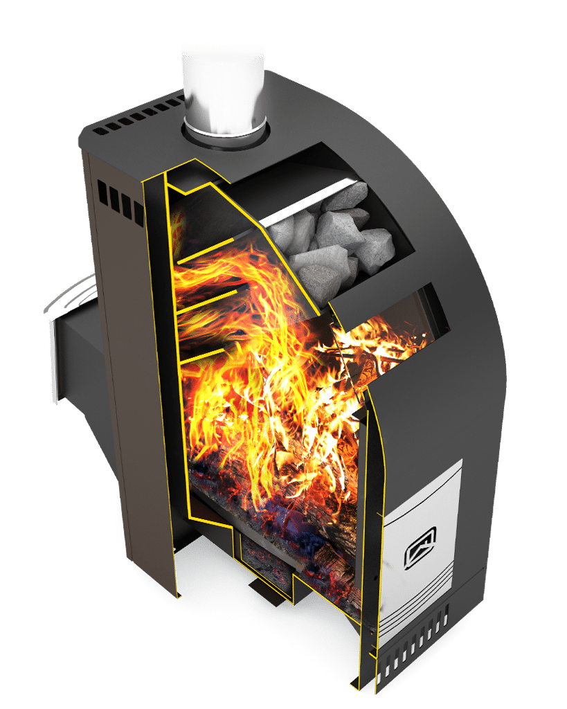 - закрытая. Камни сложены в отдельный отсек, полностью скрытый внутри корпуса печи. для подачи пара надо открыть специальную дверцу.