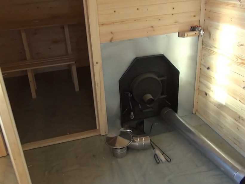Располагать печку необходимо так, чтобы поддув и топочная располагались в предбаннике. Так, не нужно будет выводить дополнительно отопление в баню. Печную трубу теплоизолируют и через цоколь выводят на улицу.