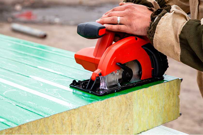 С помощью циркуляционной пилы можно получить ровный срез для выполнения прочного стыка между элементами. В местах примыкания сэндвич-панелей к колоннам или стенам из железобетона необходимо использовать самоклеящуюся ленту.