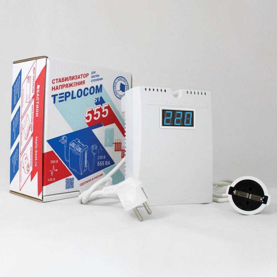 - Инверторные. Инверторные или «двойного преобразования» стабилизаторы являются лучшими в качестве передаваемого выходного напряжения. При помощи выпрямителя ток преобразуется из переменного в постоянный, а затем благодаря инвертору, обратно в переменный. Это позволяет получить высокоточный сигнал на выходе при плохом непостоянном сигнале на входе. Инверторные стабилизаторы отлично подходят не только для газовых котлов, но и для электроники и бытовых приборов. Главным их недостатком есть немаленькая стоимость, но этот момент не критичен, если нужно сохранить жизнеспособность котла и электроники. Из хороших и относительно недорогих можем посоветовать Бастион Teplocom ST-400 Invertor — хорошо работает с котлами разных производителей.