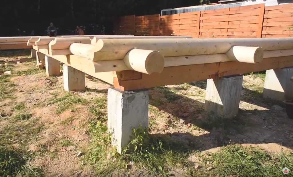 Бруски были уложены на фундаментные столбики – 4 шт. по периметру беседки и 1 шт. в центре, вдоль длинной стороны. По окончании процесса, дерево было обработано огнебиозащитой.