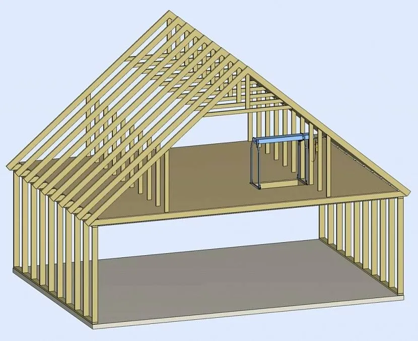 Шаг 2. Приступайте к установке обыкновенных стропил. В местах упора с мауэрлатом надо запилить площадку, верхний конец фиксируется к коньковому прогону.