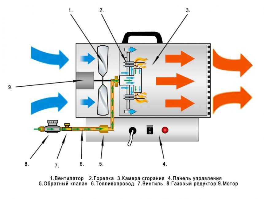 При прогреве зданий и гаражей с очень низких температур от -20С и далее, можете столкнуться с еще одной проблемой. Вентилятор на таком морозе будет плохо набирать обороты. В этот период не стоит сразу же подавать газ. Как только лопасти раскрутятся, тогда и включайте подачу.