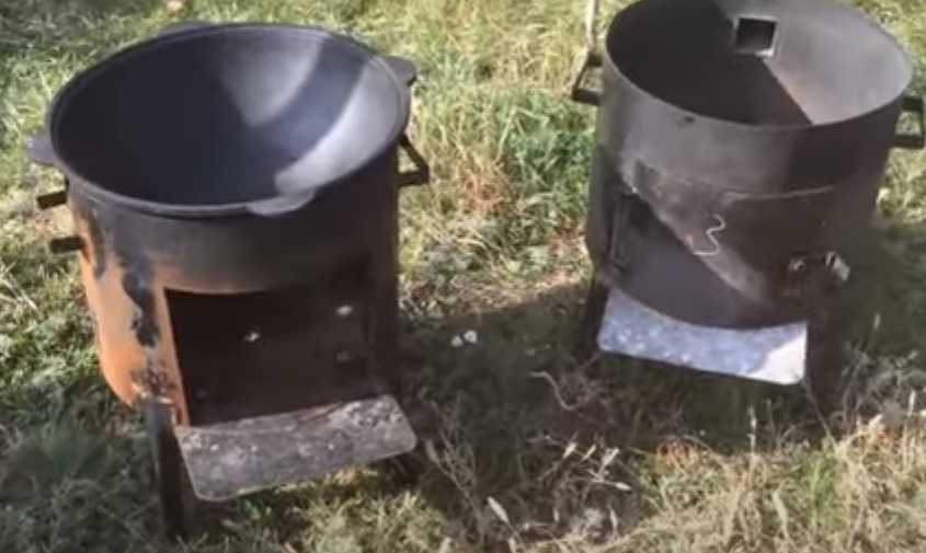 Таким образом, получается модель печи для казана, в которую удобно закладывать топливо и вычищать продукты сгорания, дым отводится в трубу, а дверцей поддувала легко регулировать тягу. Но для перевозки эта печь менее комфортна, так как занимает больше места.