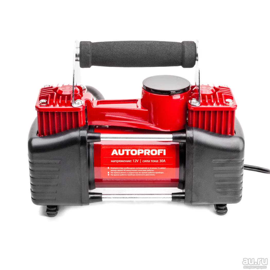 Еще один неплохой двухпоршневой вариант, оборудованный металлическим корпусом. В нем есть электронный манометр, встроенный фонарик, а также набор переходников. В комплекте прилагается специальный контейнер для переноски прибора и его составных частей.