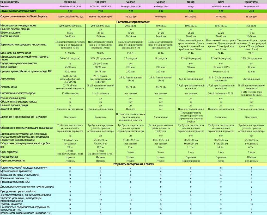 В заключение приводим сводную таблицу нашего общего РР рейтинга роботов-газонокосилок, испытанных нами за прошедший год. Закономерно «Царем горы» в рейтинге стала старшая серия моделей Израильского производителя.
