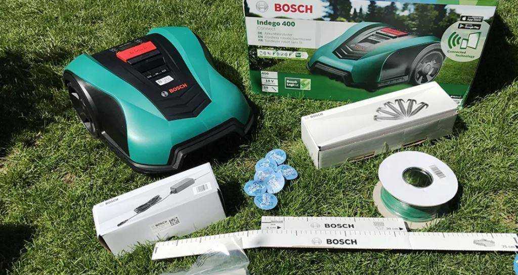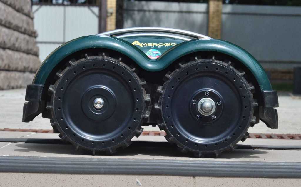 Модель газонокосилки фирмы Бош оказалась намного компактнее. Маркировка «400» указывает, что это наибольшая обрабатываемая площадь в квадратных метрах. Из четырех колес ведущие только два, поэтому роботизированная газонокосилка труднее преодолевает неровности по сравнению с конкурентами. Уклон 27% для нее будет непосильным.