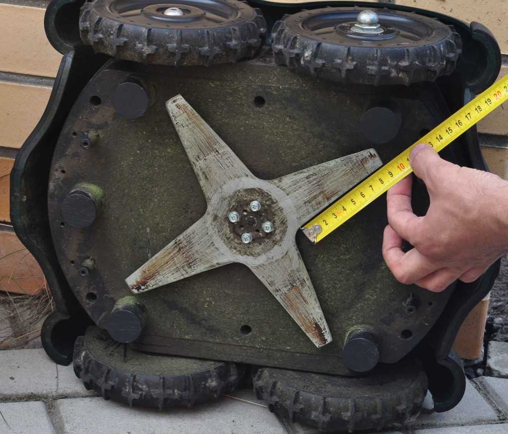 Если говорить о конструкции, то по сравнению со шведским роботом L50 впечатляет больше. Здесь уже не поворотные лезвия, а полноценный цельнометаллический нож диаметром 250 мм с четырьмя вылетами и длиной режущей кромки аж 80 мм. Это уже не идет ни в какое сравнение со скромными геометрическими параметрами у Husqvarna
