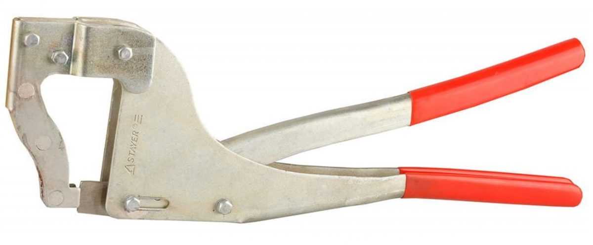 Один из популярных бюджетных продуктов, который подойдет для качественного соединения. Изготавливается из прочной стали, которая не ржавеет и не деформируется со временем. Металлическая часть оснащена специальными губками. Они способствуют эффективному пробиванию материала, а также загибают кромки во внутреннюю часть. Максимальная толщина фиксации – 9.5 мм. Инструмент оснащается прорезиненной рукояткой, которая повышает эргономию.