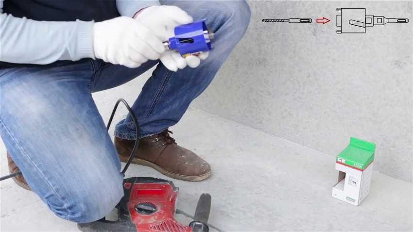 Устанавливать инструмент в патрон дрели необходимо лишь после того, как все резьбы будут затянуты. Далее можно начинать сверлить в выбранной точке. Процесс практически не отличается от работы классическим сверлом