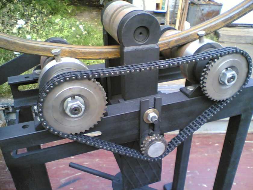 В общем и целом, собирают самодельные гибочные станки для профильных труб из того, что имеется под рукой или того, что найдут/купят недорогого. Кто имеет возможность — вытачивает ролики, вставляет подшипники. У кого такой возможности нет, используют то, что есть — вплоть до втулок от велосипедных колес. В целом надо понять конструкцию и