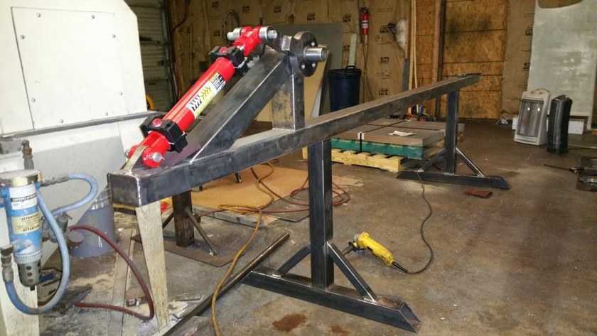 Для конструирования такового устройства нужен швеллер и домкрат гидравлический. Для домкрата изготавливается специальная полочка, в которой он устанавливается. В верхней рабочей части между двумя швеллерами монтируются два ролика из стальной трубы. Расстояние между роликами и пятаком домкрата должно быть одинаковым, чтобы иметь возможность получать ровные и аккуратные изгибы.