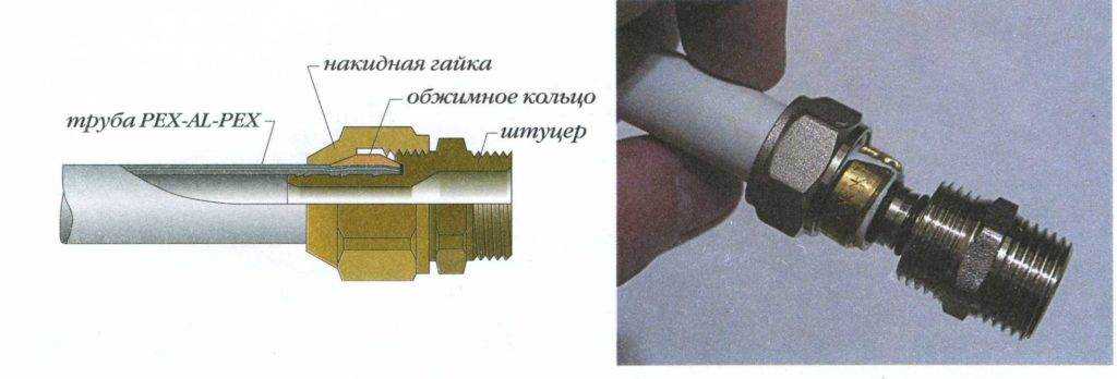 Соединение труб компрессионными фитингами — самый простой и дешевый способ. Но стоит учитывать ограничения по температуре воды, которая будет течь по трубопроводу — она не должна превышать 50°С. Недостатком является и невозможность проведения работ в стесненных условиях.