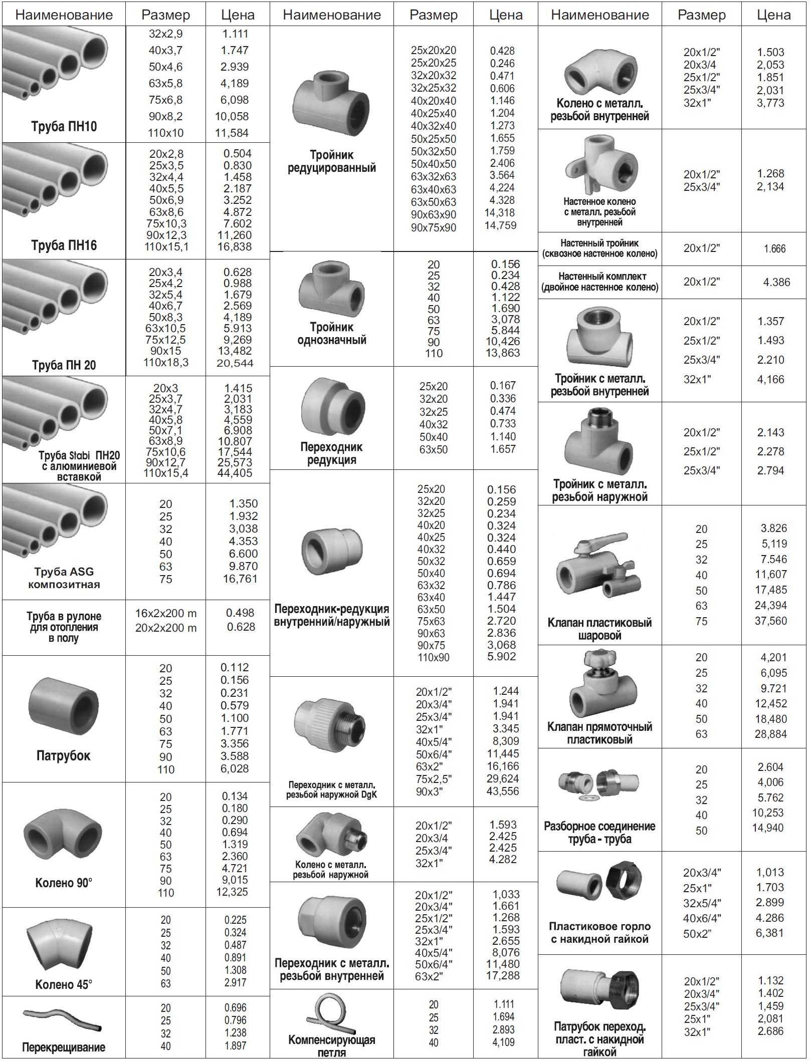 Сравнительная характеристика труб пластиковых труб и комплектующих с примерными ценами. Цены указаны в евро