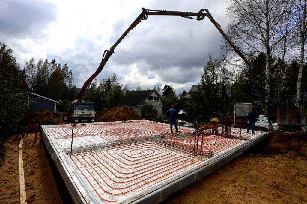 Обогревательная система проверяется до начала бетонирования. Трубы наполняются энергоносителем, делается прессовка системы для выявления участков протечек. Бетон замешивается или заказывается после проведения всех работ, а марка смеси указывается в проекте. Масса равномерно распределяется по площади плиты с применением лопат, а кельмой она загоняется в трудные места.