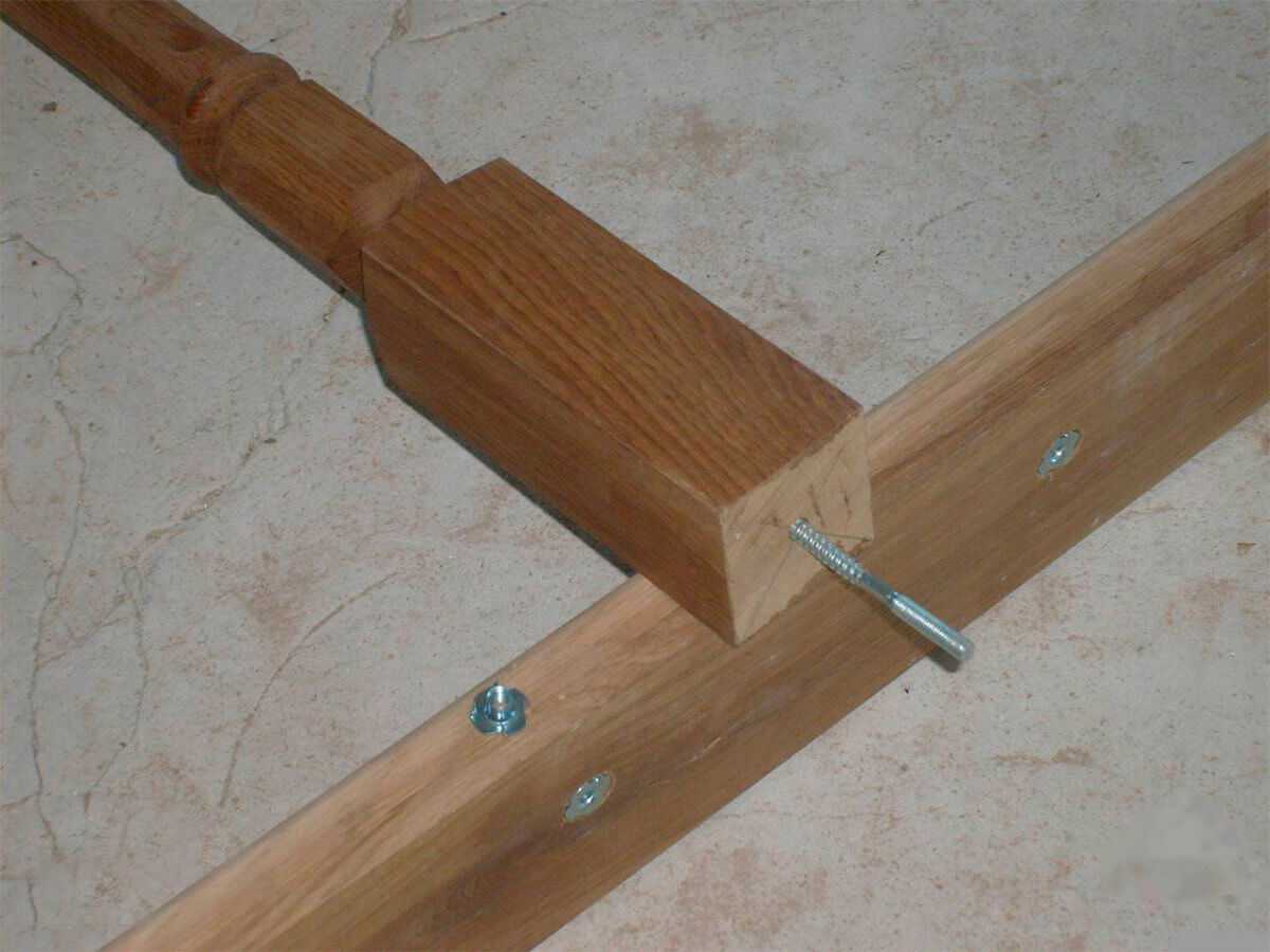 Закрепить столб к тетиве шкантами — традиционный способ. Шканты просты и могут быть сделаны своими руками. Монтаж проводится столярным клеем и шкантами, их диаметр от 8 до 12 мм, а длина до 12 см. В балясине со стороны торца делают отверстие, в которое заливается клей, ставится шкант. Как только конструкция высохла, излишек клея должен быть убран.