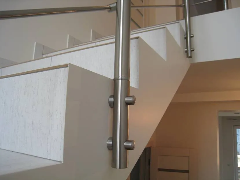В установленные подпятники вставляются металлические балясины/стойки, выставляются строго вертикально, привариваются. «Прихватывать» лучше с четырех сторон — чтобы исключить возможность отклонения в любую сторону. На этом установка балясин из металла (нержавеющей, никелированной, хромированной стали) закончена. Дальше только надо установить поручень, что тоже не особо сложно.