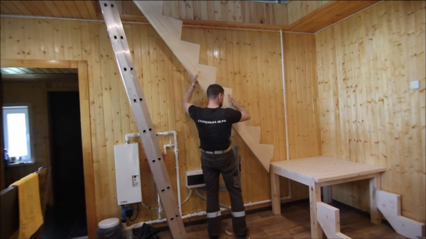 Для надежности крепления косоур вставляется в предварительно сделанный пропил в потолочной балке. В завершении для надежности он фиксируется анкерами к стенке, столбу и потолочной балке. При необходимости конструкция усиливается стальными уголками.