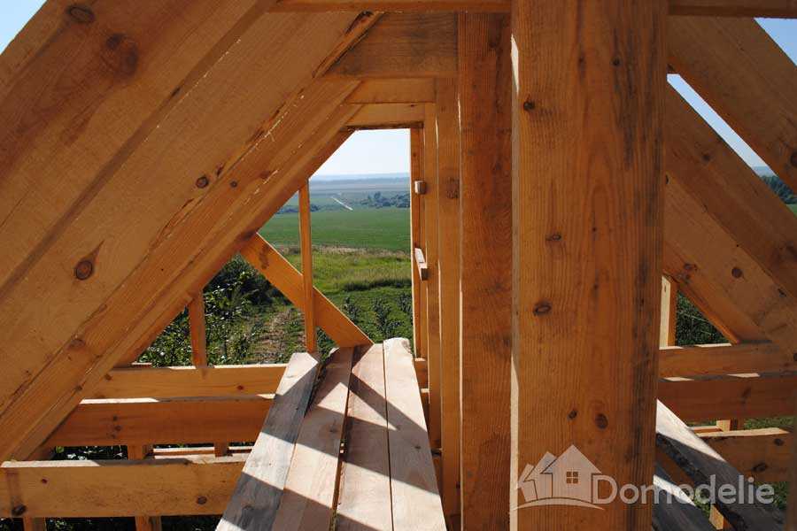 После сборки и подъема на высоту выполняется установка стропил двухскатной крыши деревянного дома. Чтобы зафиксировать их на мауэрлате, в нижней части стропил делают запилы. Первыми устанавливают две фермы с противоположных концов крыши.
