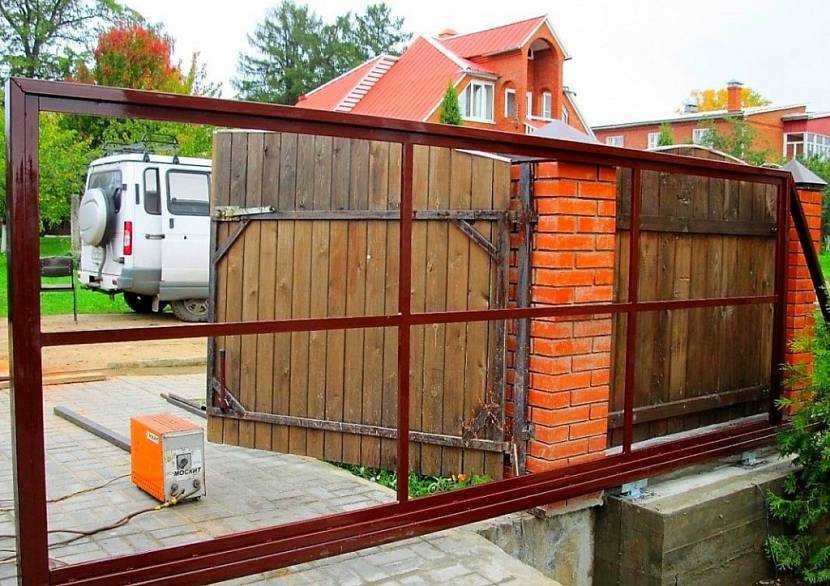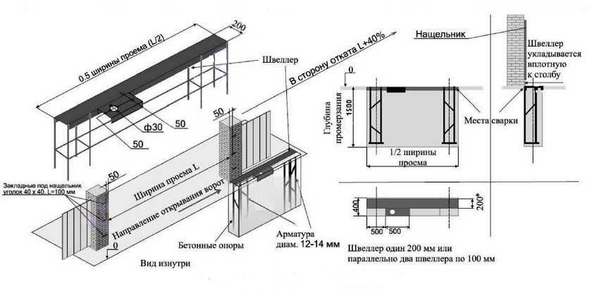 Начинать установку ворот нужно с возведения фундамента, который будет принимать на себя основную нагрузку конструкции. Сверху на нее устанавливаются опоры, по которым перемещается направляющая балка, последняя приваривается непосредственно к створкам.