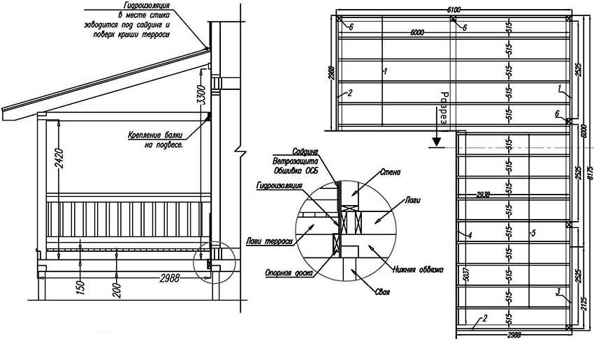 - балки/лаги для настила пола. Они могут монтироваться вдоль веранды (половая или террасная доска тогда ложится поперек), или наоборот. Количество и сечение лаг выбирается исходя из толщины половой доски и планируемой нагрузки;