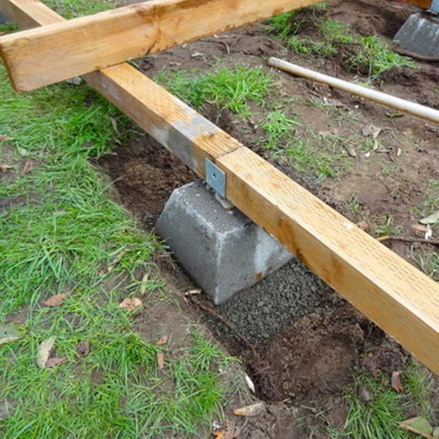 Каждый блок нужно вкопать в грунт на 15 см, и под ним нужно создать песчаную подушку, чтобы балки каркаса не начали гнить от влаги, содержащейся в почве. Можно заменить готовые блоки самодельными, залив раствор в опалубку из досок