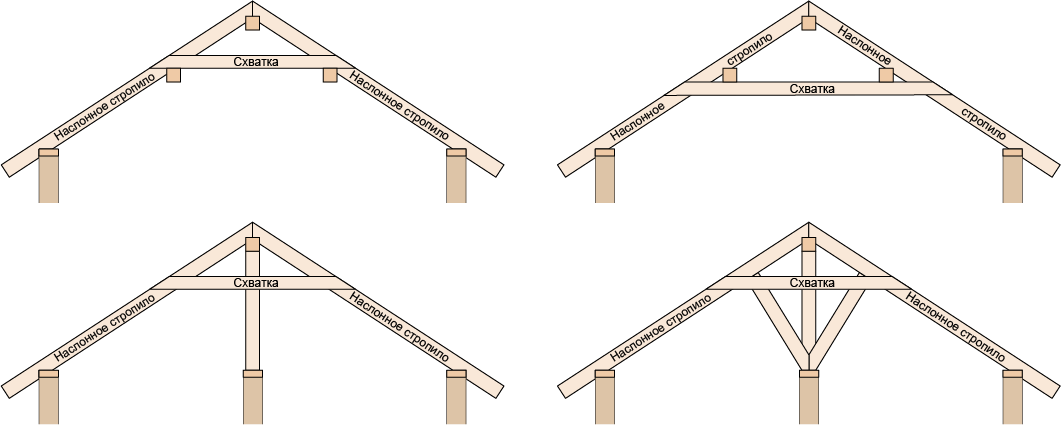 В наслонных стропильных системах также может присутствовать конструкция, связывающая стропильные ноги. Так как наслонные стропила — это одиночные элементы, то связывающая их доска называется схваткой. В нормально рассчитанных наслонных стропилах схватка нерабочий элемент, она устанавливается для придания устойчивости всей конструкции стропильной системы.