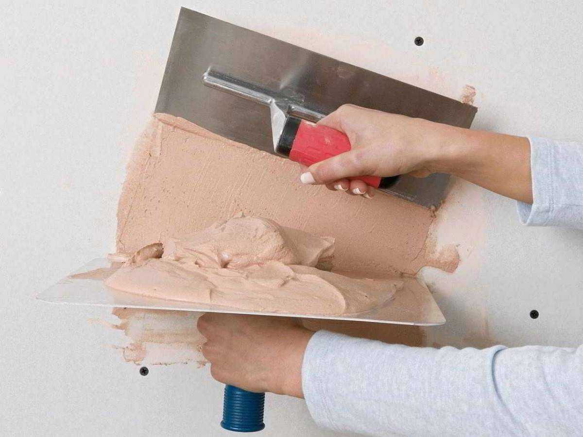 В жилых комнатах и офисных помещениях обычно используют стандартную гипсовую смесь для выравнивания. Для обработки гипсокартона не требуется нанесения стартового слоя, но перед финишной отделкой необходимо заделать швы и точки крепления листов. Стыки расшивают под углом 45 градусов, наклеивают серпянку и заполняют шпаклевкой.