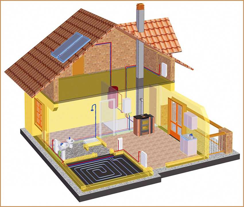 - приборов отопления: контурные элементы «тёплого пола», обвязка дома трубами или радиаторы.