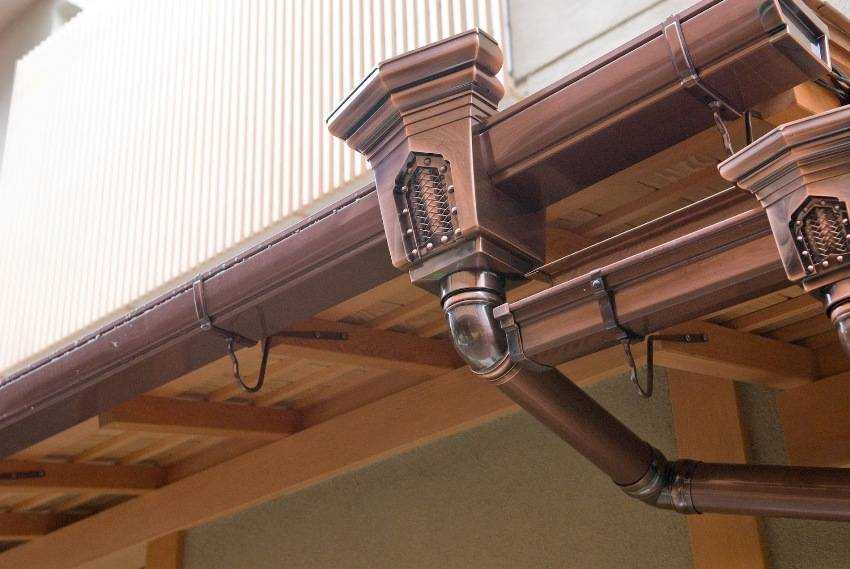 Кроме того, медные детали не подвержены коррозии. Все это делает медь почти идеальным материалом для водостока. Однако такие детали стоят достаточно дорого, поэтому используются они не часто. Чаще всего их монтируют на медных или черепичных крышах.