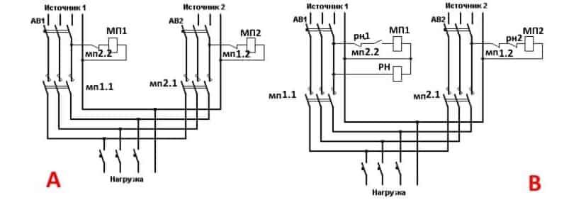 Рассмотрим схему «А», у которой два равноправных ввода. Чтобы не допустить одновременное подключение линий применяется принцип взаимной блокировки, реализованный на контакторах МП1 и МП2. От какой линии будет питаться нагрузка, определяется очередностью включения автоматов АВ1 и АВ2. Если первым включается АВ1, то срабатывает пускатель МП1, при этом разрывается контакт мп1.2, блокируя поступление напряжение на катушку МП2, а также замыкается контактная группа мп1.1, обеспечивающая подключение источника 1 к нагрузке.