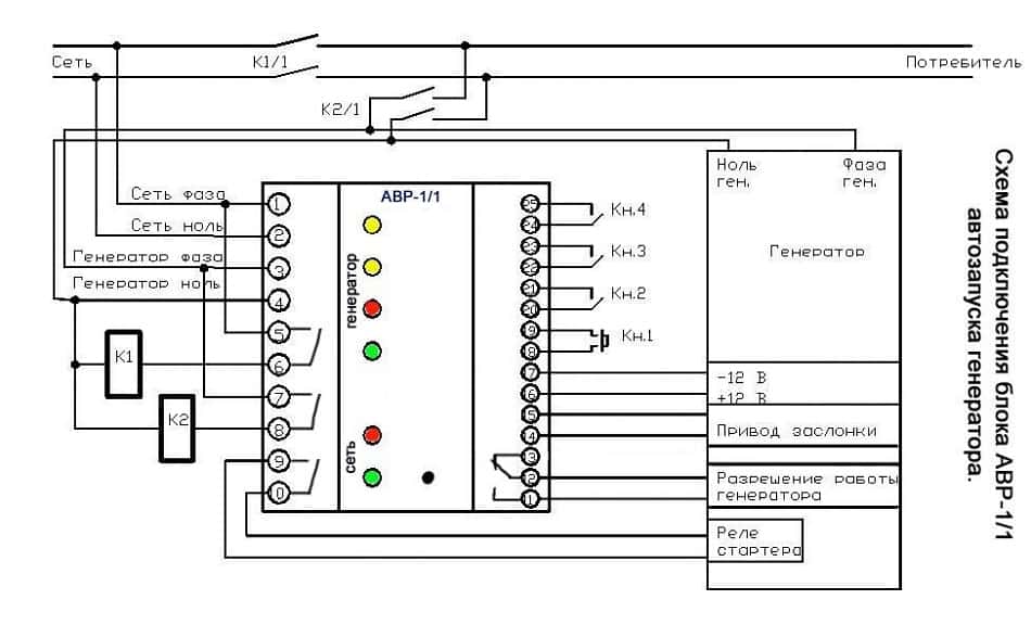 Детальная схема подключения блока автоматического запуска генератора показана на рисунке 6. На схеме К1 и К2 – это контакторы. Цифрами в кружках обозначены номера клемм. Пользуясь этой схемой не сложно подключить такой блок самостоятельно.