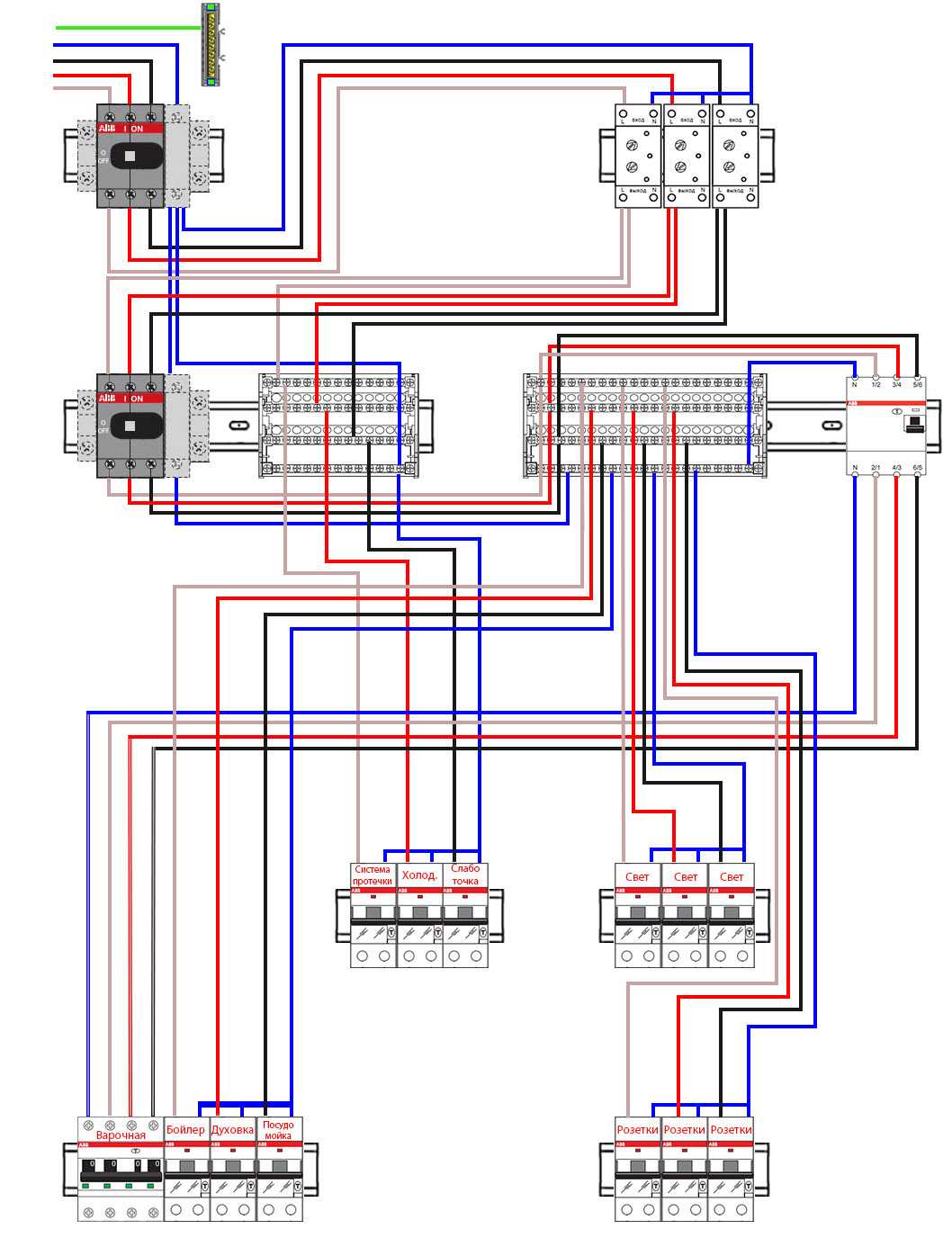 - Развести по УЗО, нулевой шине, заземлению и другим имеющимся защитным системам.