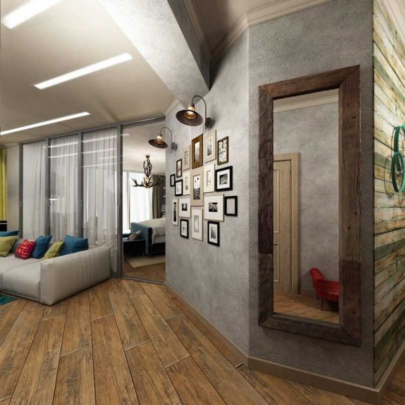 По фото прихожих в стиле лофт видно, что для оформления напольного покрытия обычно применяются натуральное дерево с потертостями либо паркет, который был искусственно состарен.