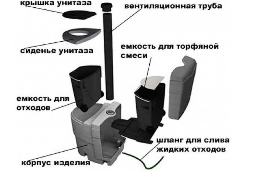 Любая конструкция торфяного биотуалета для дачи включает приемную емкость, бачок для торфа, дренаж, вентиляционную уличную отдушину.