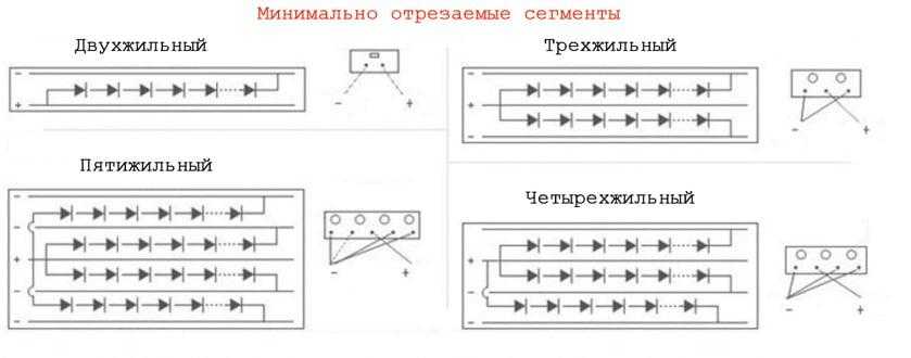 Светодиоды внутри кабеля объединяются в группы, которые подключаются параллельно. В зависимости от длины такой группы кабель можно разрезать на отрезки. Обычно длина составляет один, два или четыре метра. Место для разреза отмечается на поверхности кабеля специальной риской.