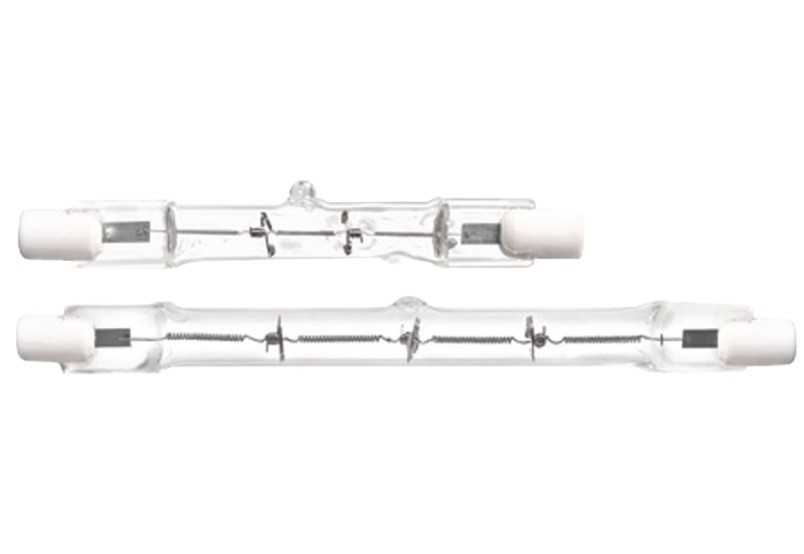 Это самый старый тип галогеновых ламп. Он разработан в 60-е годы прошлого века. Такая лампа представляет собой кварцевую трубку, которая с обеих сторон имеет выводы. Особые проволочные кронштейны удерживают нить накала. Вопреки своим малым размерам, лампа имеет довольно большую мощность — до 20 кВт и позволяет обеспечить высокую яркость. По этой причине их почти не применяют в быту, зато широко используют при прожекторном освещении. Правда, последние модификации линейных галогеновых светильников – галогенные лампы заливающего света характеризуются высокой прочностью и могут с равным успехом применяться как при внутреннем, так и при наружном освещении.