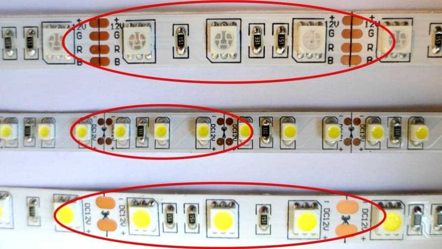 Конструкция цветных лент отличается от простых большим количеством питающих шин. Изделия RGB имеют 4 шины и 4 площадки на границе секторов, RGBW – 5 шин и 5 контактных точек. Аккуратный разрез в обозначенных местах, сохраняет работоспособность отрезка.