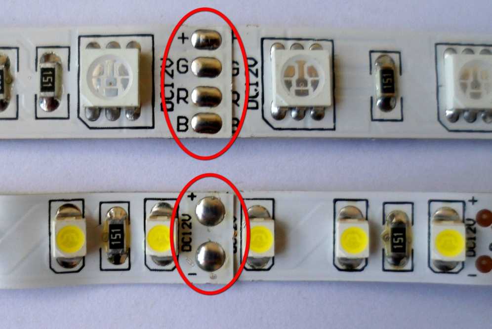 Как и в случае с монохромной, разрезать, а потом соединить, светодиодную ленту RGB или RGBW, можно по специальной метке, или же визуально определить секции. Главное при соединении сегментов не попутать шины питания по цветам. Контроллер, управляющий игрой цветов, при ошибочном подключении может вывести из строя источник света или сломаться сам.