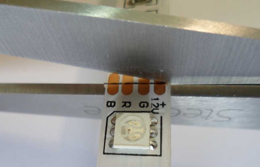 Все низковольтные LED-ленты можно резать в строго отмеченных местах. Линия разреза проходит через контактные площадки — это «+» и «−» у одноцветных моделей и «R», «G», «B» и «V+» у многоцветных. Это касается моделей с напряжением питания 5, 12 и 24 В.