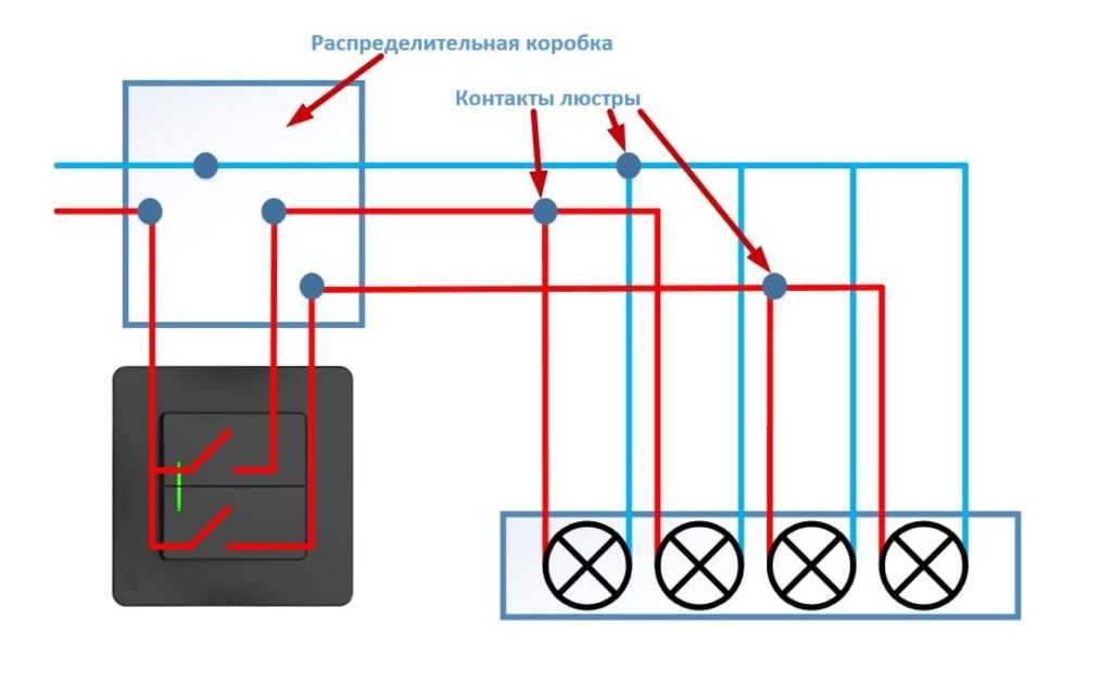 Общая схема подключения люстры к двухклавишному выключателю выглядит так: