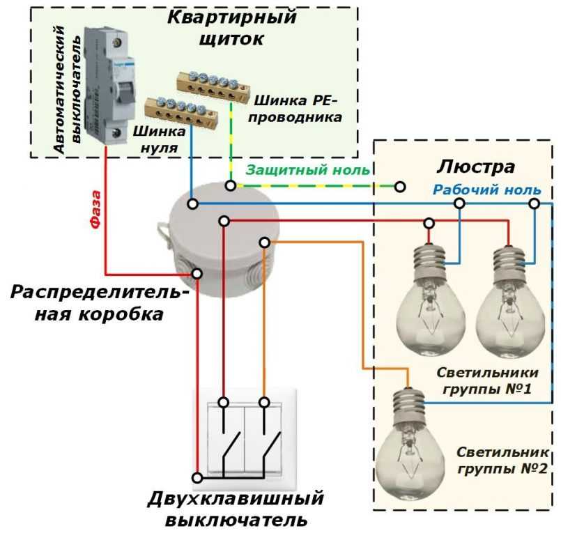 Схема подключения люстры с тремя проводами к двухклавишному выключателю