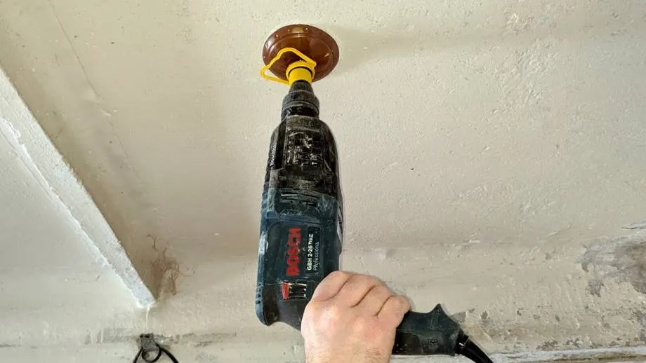 В такой ситуации на ГКЛ после разметки выполняется отверстие тем же способом – размером под сокрытие декоративным розетом. А бетонное основание под монтаж крюка сверлят перфоратором с длинным буром – диапазон их диаметров широк. Затем крюк или анкер вставляют в отверстие в бетоне и затягивают подходящим инструментом, например, торцовым ключом.