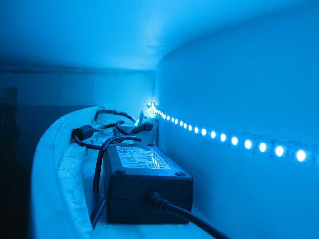 - Подключите диммер (выключатель) и установите блок питания. Усилители и выключатель необходимы в том случае, если требуется менять яркость подсветки во время использования. Такие детали схемы устанавливаются вместе с блоком питания. Для регулирования освещения можно использовать как пульт, так и обычный выключатель.