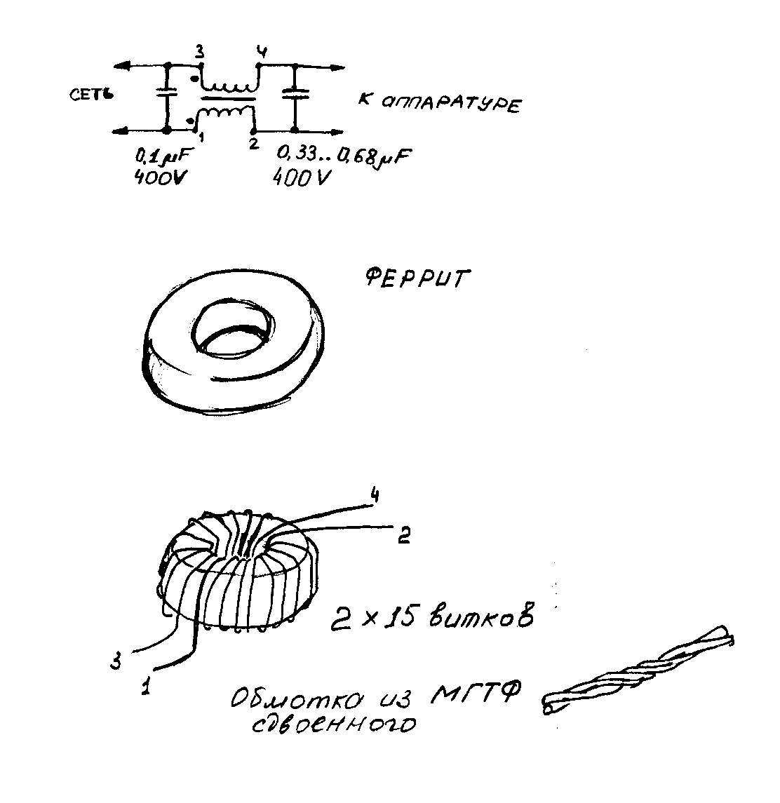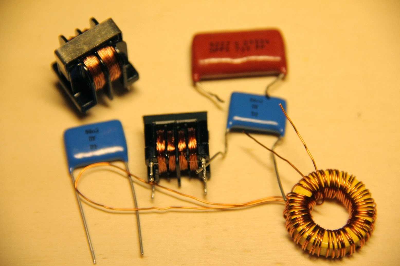 Служат для подавления помех последовательным способом (включением большого сопротивления). Основные требования к проводу, как и для сетевого шнура, т.е. плотность тока через провод должна быть менее чем 10 А/мм 2, чем больше размер катушки, тем больше индуктивность, тем лучше. Наличие феррита улучшает свойства индуктивности. Тороидальные ферритовые сердечники предпочтительнее линейных, хотя и более трудоёмкие в изготовлении.