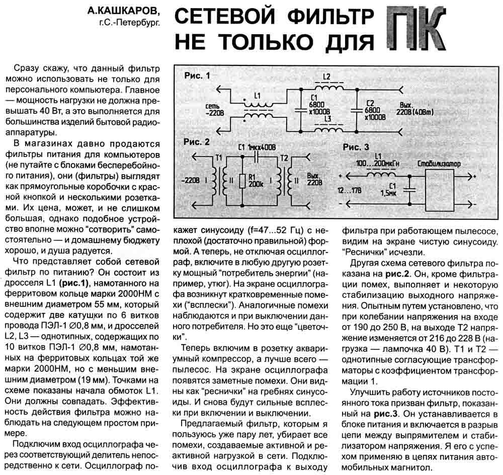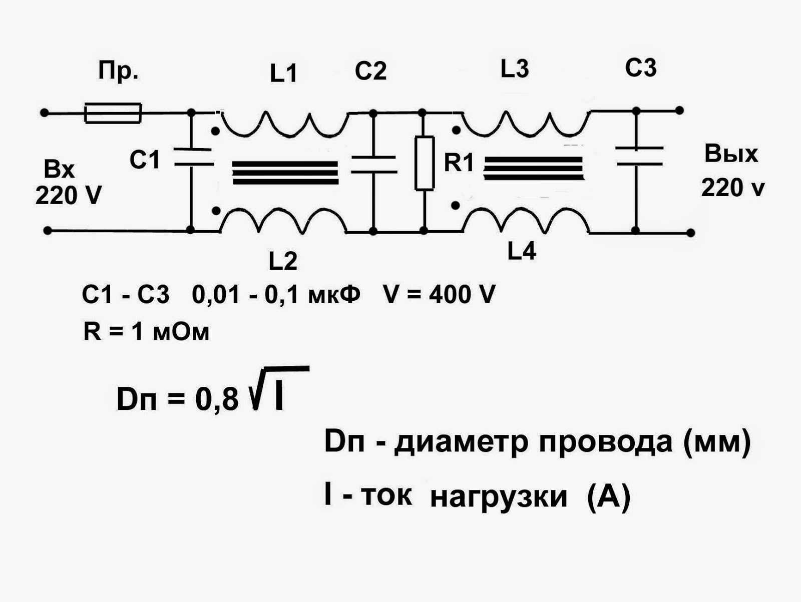 Обычно сечение проводов в сетевых фильтрах составляет 0.75 мм 2 или 1мм 2, что вполне достаточно, так как ток нагрузки не должен превышать 10А (2.2 кВА), на него рассчитан предохранитель. Очень редко встречаются, так называемые, фильтры повышенной мощности, у которых сечение провода может составить 1.5 мм 2 и более. Предохранитель у них обычно рассчитан на 16 ампер, но их применение для аппаратуры малой мощности нецелесообразно.