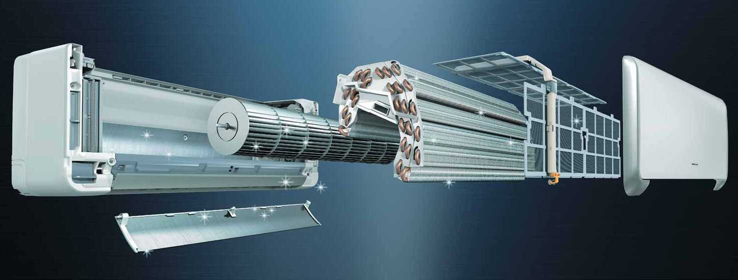 Во внутреннем блоке расположены испаряющий радиатор, устройства фильтрации (от пыли, бактерий и других компонентов, в зависимости от модели), плата управления. Также в него помещается двигатель вентилятора, генерирующий куда меньше шума, чем наружный.