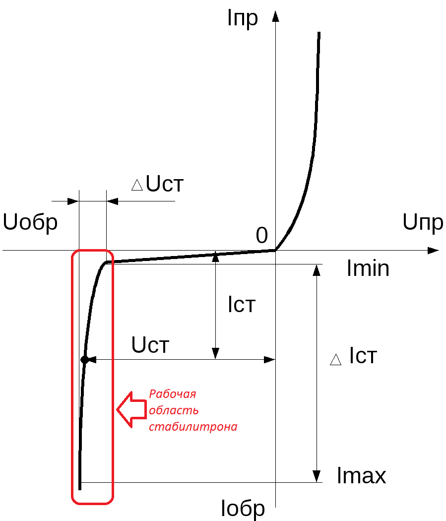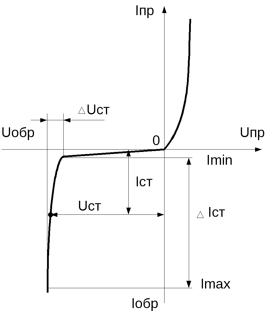 Iст, Imax, Imin — это сила тока, которая течет через стабилитрон при его работе.