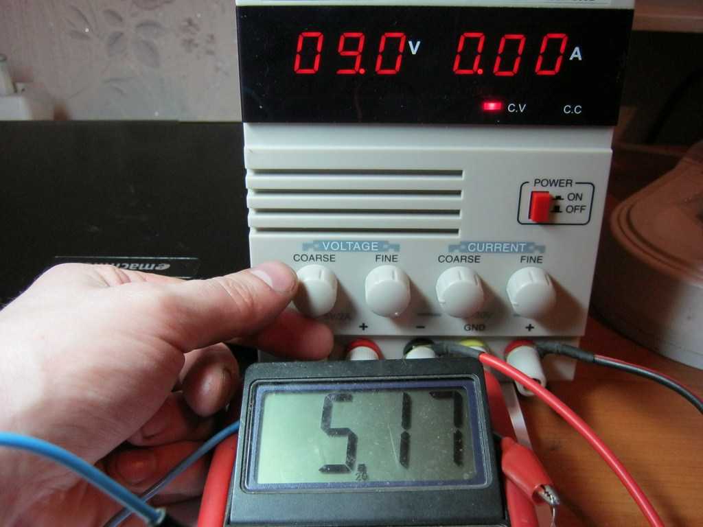 Теперь внимательно следим за показаниями мультиметра и блока питания: