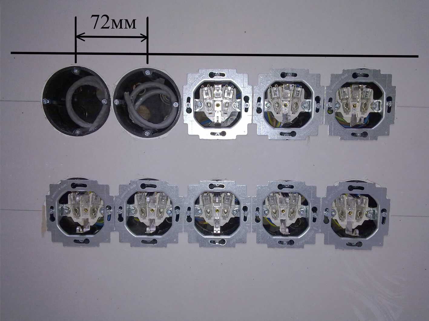 Итак, переходим ближе к основному процессу. Сначала согласно схеме электропроводки Вы должны определить, где нужно врезать отверстие под установку розетки в гипсокартонной перегородке. В выбранном месте поставьте маркером крестик на гипсокартоне, который будет центром будущего отверстия. Если Вы решили установить блок розеток в гипсовой стене (сразу несколько штук), нужно в ряд сделать несколько круглых штроб. Кстати высота установки розеток не нормируется ГОСТом либо правилами ПУЭ, поэтому можете разместить «электрическую точку» где Вам угодно. Для этого используйте строительный уровень и одно простое правило – расстояние между центрами должно быть 72 мм, как показано на фото ниже. Сделав разметку можно переходить к штроблению листа ГКЛ.